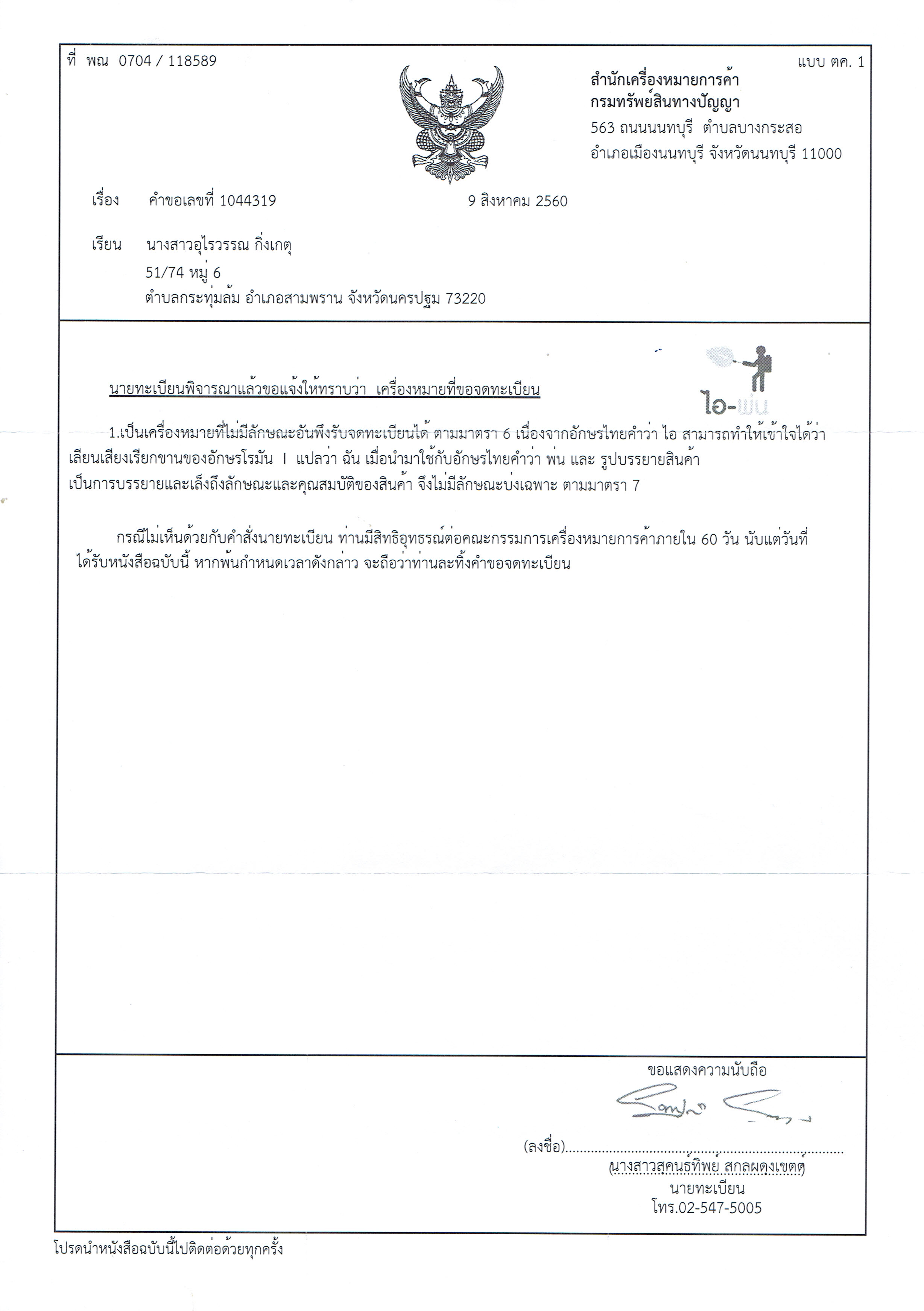 ตัวอย่างการจดโลโก้ที่ไม่สามารถจดได้ เช่นลักษณะเฉพาะ ลายธงชาติ คำบางคำเช่น เฮียสั่งลุย เมียสั่งลุย ประโยควลีลอยๆ