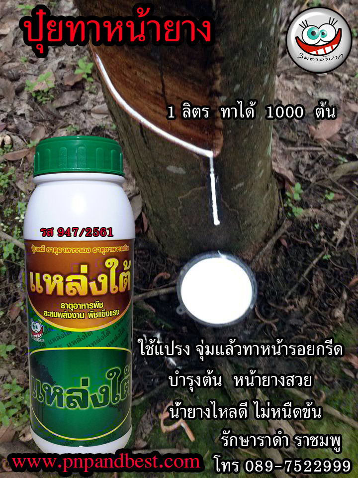 แหล่งใต้ เป็นยาทาหน้ายาง ช่วยให้หน้ายางนิ่มกรีดง่าย เพิ่มน้ำยางได้20-30 เปอร์เซนต์ บำรุงต้นยาง รักษาเชื้อรา ราดำเส้นดำ ราชมพู หน้ายุง หน้าเน่าโคนเน่า เชื้อราที่เกิดจากไฟท๊อปเธอร่า 1ขวด (ลิตร) ทาได้ 1000 ต้นหรือประมาณ12-13ไร่