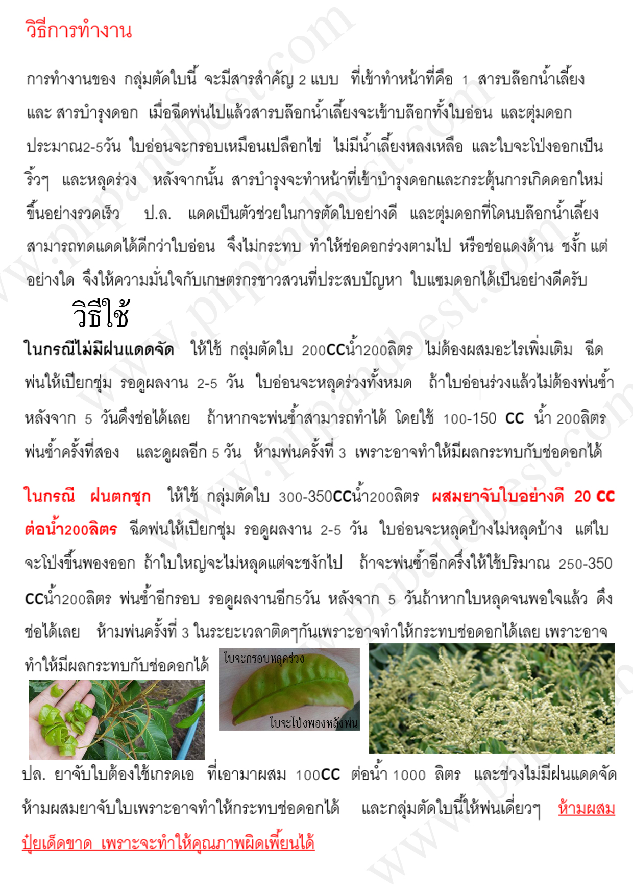 การทำงานของ กลุ่มตัดใบนี้ จะมีสารสำคัญ 2 แบบ ที่เข้าทำหน้าที่คือ 1 สารบล๊อกน้ำเลี้ยง และ สารบำรุงดอก เมื่อฉีดพ่นไปแล้วสารบล๊อกน้ำเลี้ยงจะเข้าบล๊อกทั้งใบอ่อน และตุ่มดอก ประมาณ2-5วัน ใบอ่อนจะกรอบเหมือนเปลือกไข่ ไม่มีน้ำเลี้ยงหลงเหลือ และใบจะโป่งออกเป็นริ้วๆ และหลุดร่วง หลังจากนั้น สารบำรุงจะทำหน้าที่เข้าบำรุงดอกและกระตุ้นการเกิดดอกใหม่ขึ้นอย่างรวดเร็ว ป.ล. แดดเป็นตัวช่วยในการตัดใบอย่างดี และตุ่มดอกที่โดนบล๊อกน้ำเลี้ยง สามารถทดแดดได้ดีกว่าใบอ่อน จึงไม่กระทบ ทำให้ช่อดอกร่วงตามไป หรือช่อแดงด้าน ชงั้ก แต่อย่างใด จึงให้ความมั่นใจกับเกษตรกรชาวสวนที่ประสบปัญหา ใบแซมดอกได้เป็นอย่างดีครับ