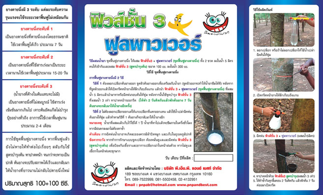 ฟิวส์ชั่น3+ฟูลพาวเวอร์ ชุดรักษายางตายนึ่ง มีคุณสมบัติดังนี้ สวนยางของท่าน จะปลอดโรค ยางตายนึ่ง ยางเปลือกแตก ผลผลิตน้ำยางเพิ่ม 20%-60% โดยที่ต้นยางไม่โทรม ค่าDRC สวิง บวกลบ 3% ขายได้กำไรดี ย้ำอีกครั้งนะครับ ไม่ใช่สารเร่ง ชุดรักษายางตายนึ่ง 1 ชุด รักษาได้ประมาณ 10 ต้นนะครับ